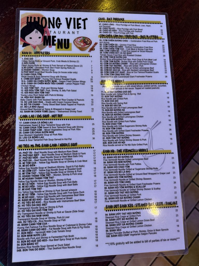 The variety of choices available includes popular options like pho, noodle soups, and rice vermicelli dishes. Pho with beef or chicken is prepared with a rich broth that is simmered to perfection, while the noodle soups with seafood or roasted pork and shrimp provide a satisfying meal with diverse flavors. Rice vermicelli dishes such as grilled chicken with lemon sauce and grilled beef with lemongrass are among the favorites. The use of fresh ingredients ensures that each dish is bursting with flavor. For those seeking something different, the Huong Viet platter and Saigon pancake with pork and shrimp offer unique tastes and textures. Appetizers such as crispy spring rolls and sweet and sour shrimp soup are recommended for an introduction to the menu. These dishes highlight the restaurant’s dedication to authentic Vietnamese cuisine and are often enjoyed by first-time visitors. A visit to Huong Viet Restaurant provides an opportunity to explore a menu that showcases the rich culinary traditions of Vietnam. Each dish is crafted to offer an exceptional dining experience, inviting all to try and savor the diverse and flavorful offerings available.